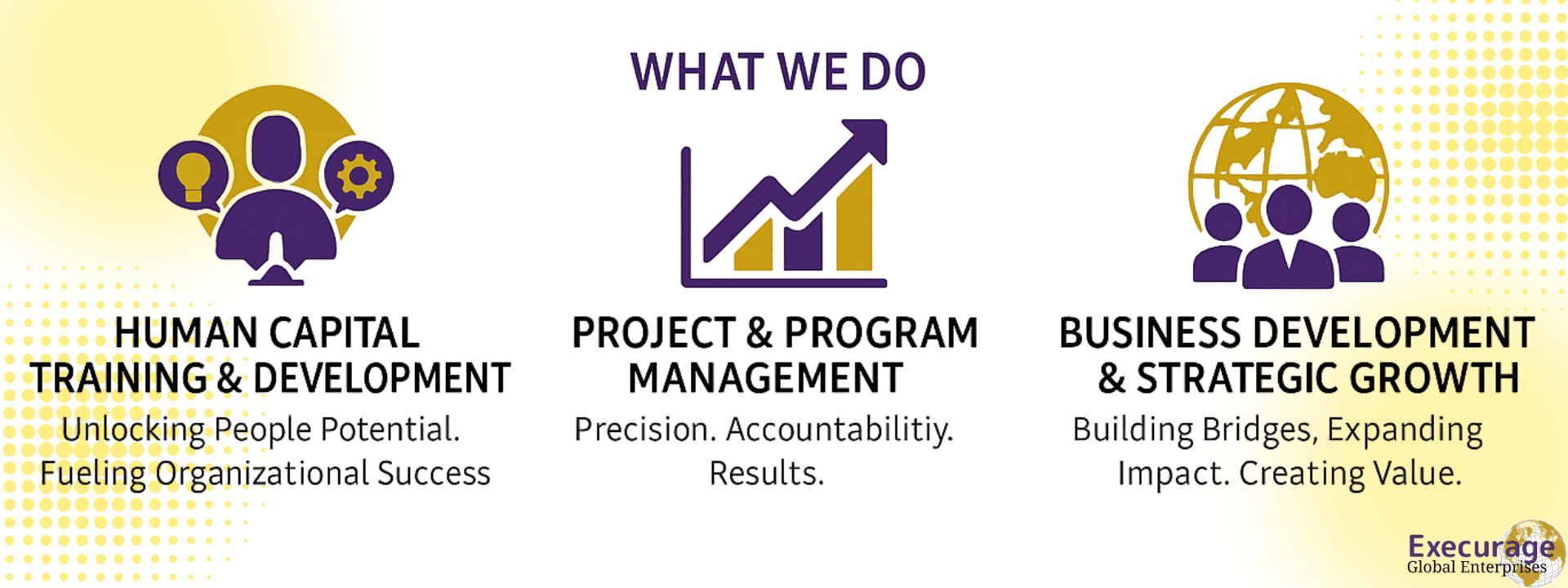 Execurage Global Services is a Georgia-based professional services firm committed to advancing excellence, equity, and innovation across diverse industries. We provide high-impact solutions in Human Capital Training and DevelopmentProject and Program Management, and Business Development and Strategic Growth. Our multidisciplinary team brings decades of experience to bear, serving corporations, government entities, nonprofit organizations, and mission-driven small businesses with tailored services that drive both performance and purpose.
