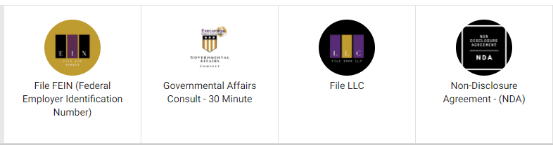 Includes the items you need to start your company with a good foundation, including LLC Filing, FEIN number Filing, NDA, and a 30-minute consult with governmental affairs.